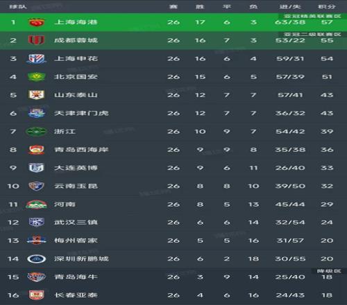 中超最新积分榜